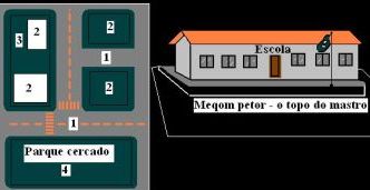 | Os quatro recintos do chabat em representação moderna, para servir de exemplo. (1) ruas - rechut ha-rabim; (2) casas particulares - rechut ha-iaĥid; (3) quintal cercado que possui portão ou trave, associado entre duas famílias (por 'eruv); (4) exemplo de carmelit - parque público cercado. Na gravura ao lado vê-se o melhor exemplo de meqom petor (lugar de isenção): o topo do mastro da bandeira. Não é o caso único de nenhum deles. Somente os melhores exemplos. |
